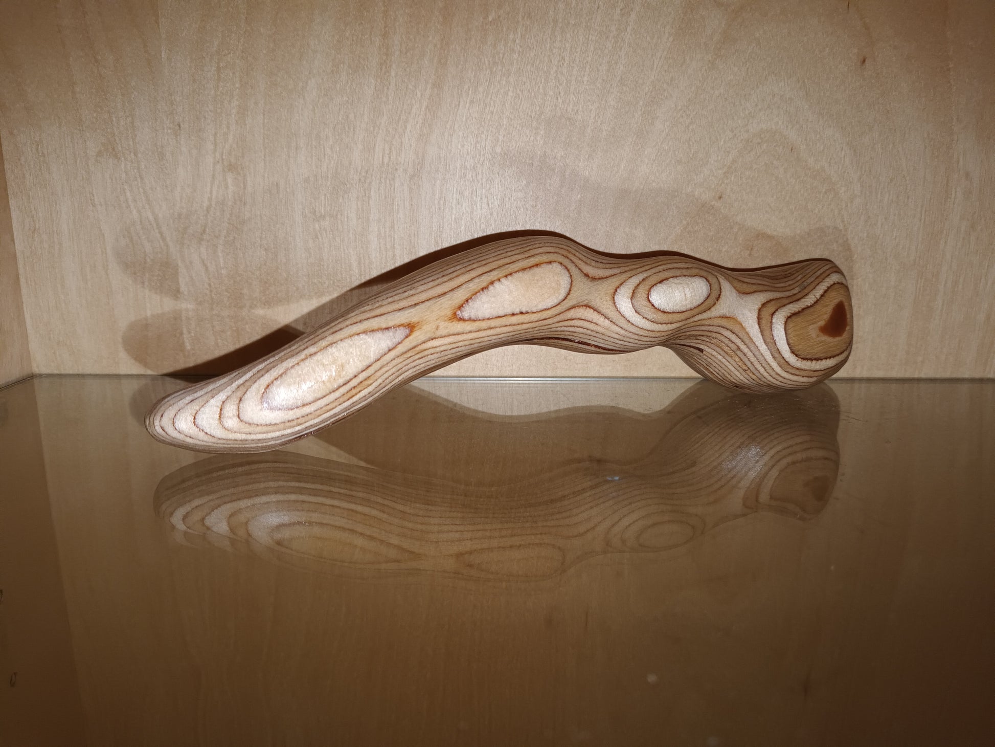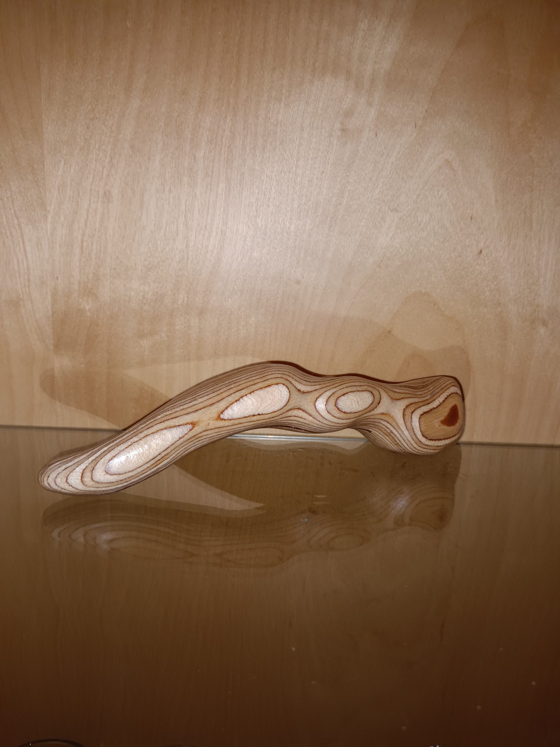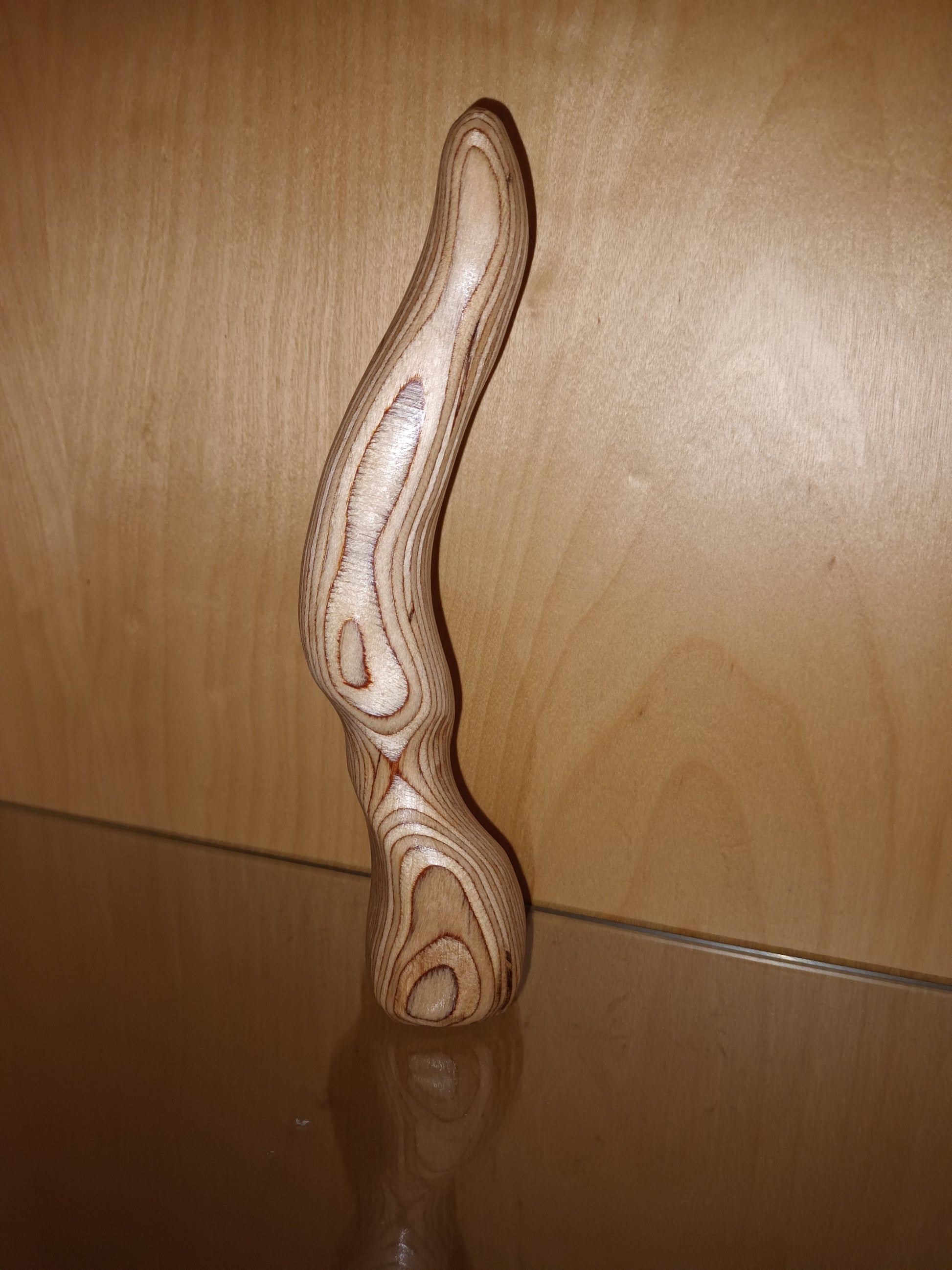 Bei diesem besonderen Stück ,mit seiner ganz eigenen Form kann der Werdegang vom Ast zum Dildo auf Bildern nicht mitverfolgt werden. In diesem Fall ist das Holz ein Mehrfachschichtenholz , sogenanntes Gewehrkolben Holz